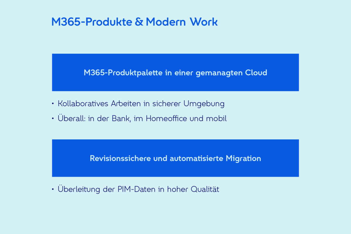 Die agree21M365-Einführung bildet daher einen wesentlichen Bestandteil der digitalen Transformation der Banken. Das kommt bereits durch den Programmnamen „way2digitalwork“ zum Ausdruck. Atruvia unterstützt und begleitet die Banken mit ganzheitlichen Einführungs- und Unterstützungsleistungen, auch in puncto Ausrichtung der Kommunikations- und Kollaborationsprozesse auf Modern Work. Darüber hinaus qualifiziert Atruvia die Mitarbeitenden zur Steigerung der digitalen Kompetenz. Regulatorische, technische und migrationsrelevante Aspekte werden ebenfalls berücksichtigt.